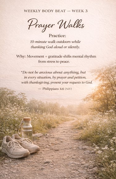 Prayer Walks invite your body and spirit to work together. Movement releases tension, while gratitude redirects your thoughts. As your feet move forward, your heart learns to settle, thus shifting your mental rhythm from stress to peace.